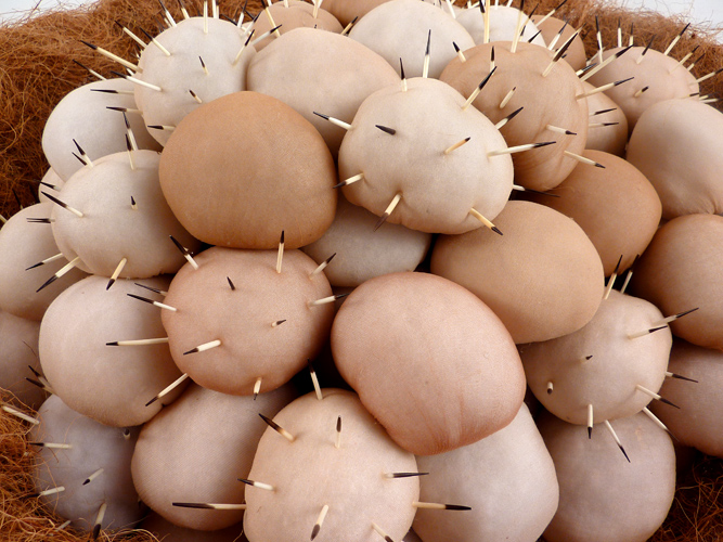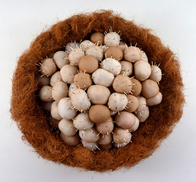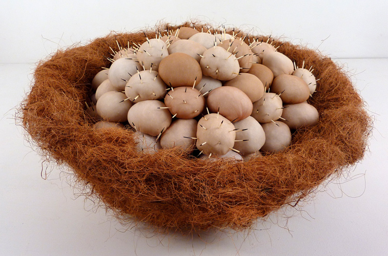 Some Bad Eggs, coconut fiber, pantyhose, polyfil, porcupine quills, and vine-wrapped wire, 27" x 26" x 13", 2013