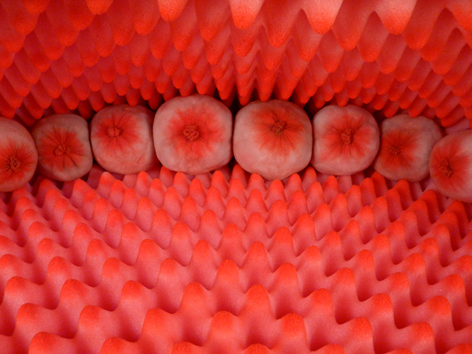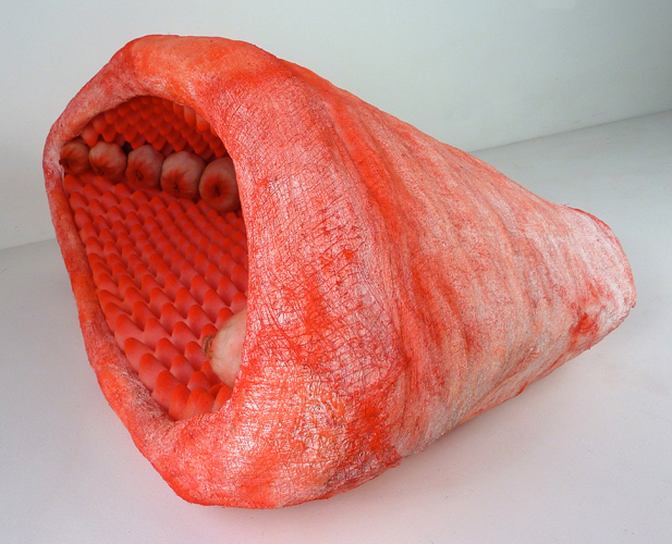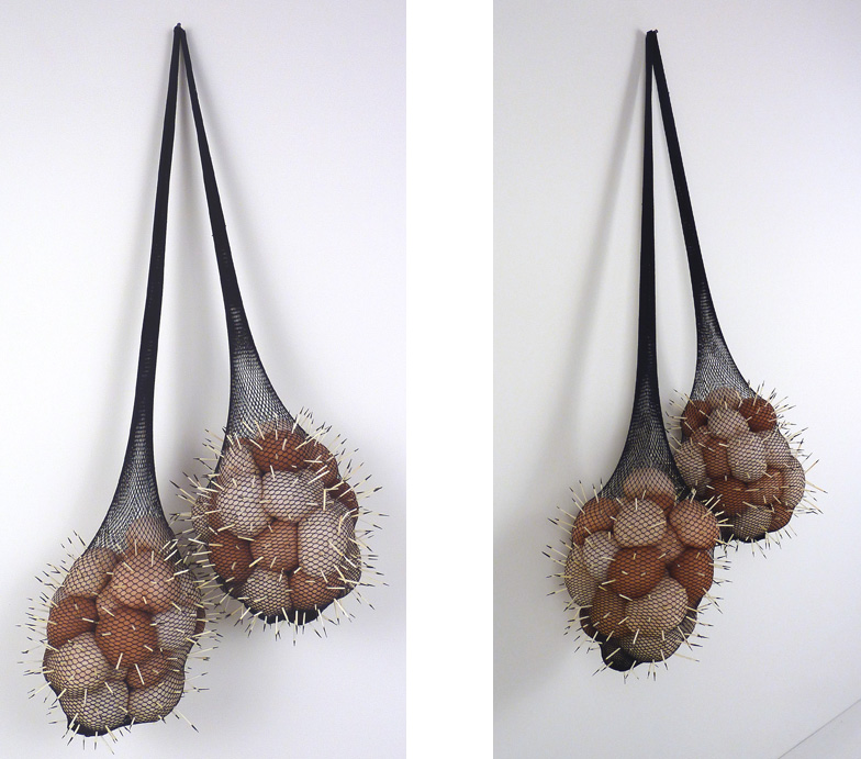 Low-Hanging Fruit, fishnet stockings, pantyhose, polyfil, and porcupine quills, 40" x 19" x 10", 2012